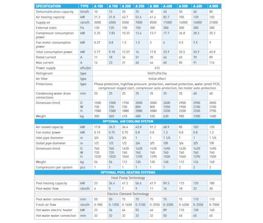 Our range is available in many sizes and configurations for domestic indoor pools to large athletic pools, natatoriums in schools and universities, commercial pools, hotel leisure pools and aquatic centers and water parks. See below some of the model specifications and contact us today for an indoor pool room evaluation